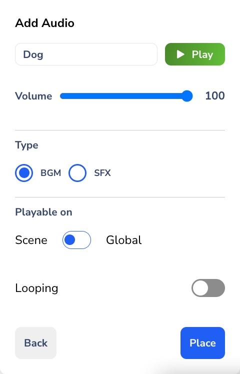Kamu bisa memasukkan dua tipe audio: BGM (background music) dan SFX (sound effects). Untuk opsi SFX, kamu harus memasukannya menggunakan Interactivity Sound Effect.