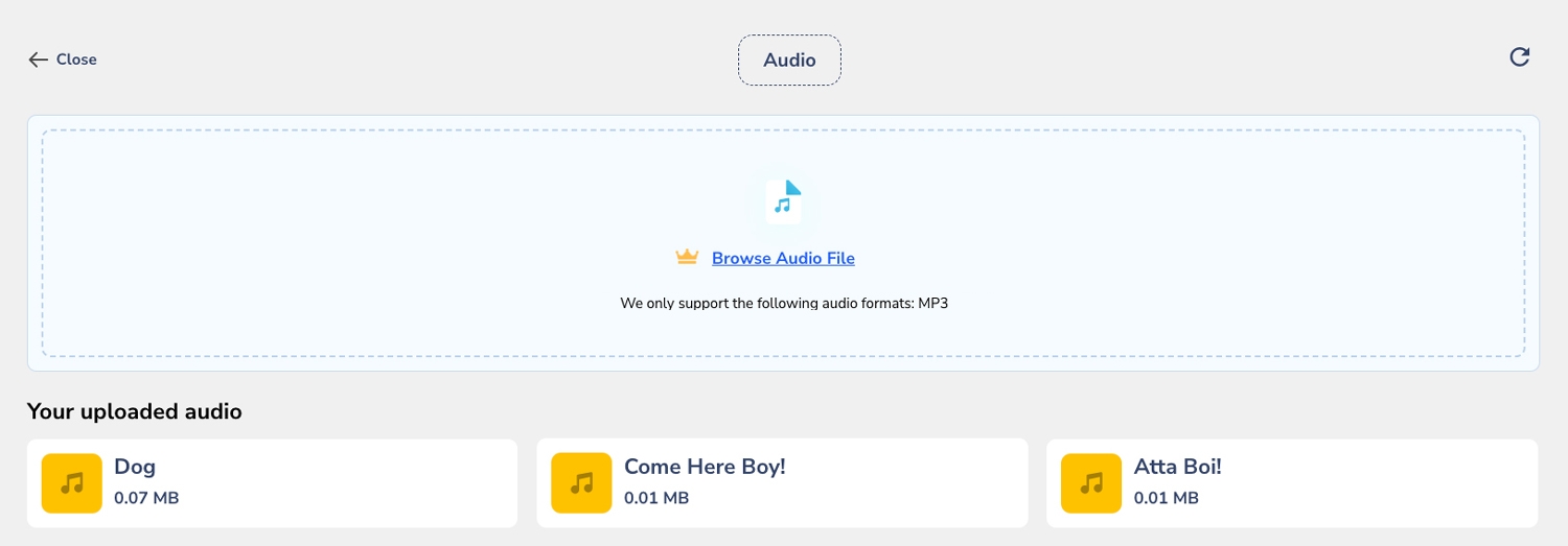 However, if you want to upload your own, we also provide you the option for that. Simply click on the Browse Audio File option, and you can import your own audio files in MP3.