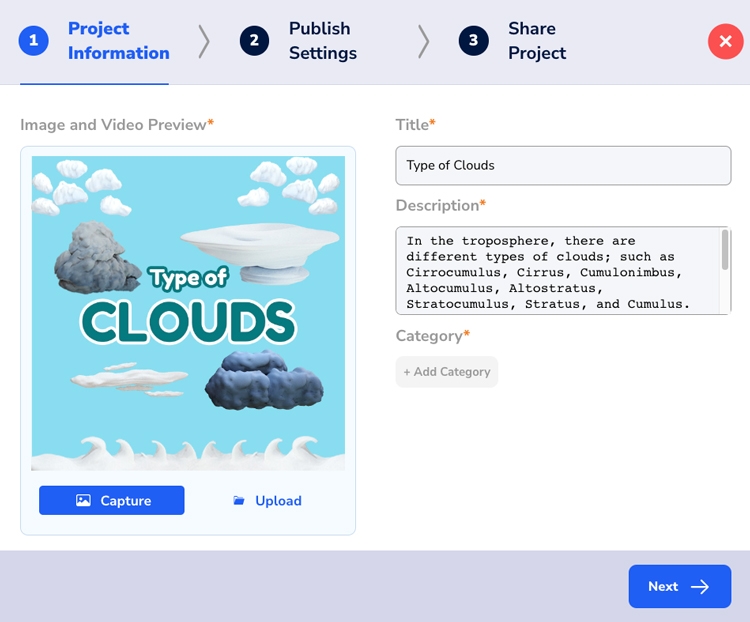 You can also fill in the details, starting from the title, description, to project's category. Once you've filled them all, click Next.
