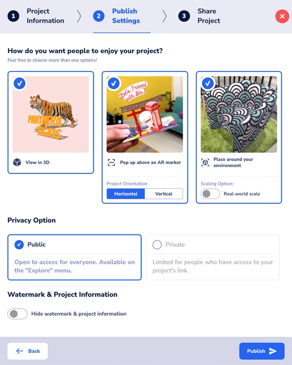 First off, you can choose how people enjoy your project—be it in a 3D or AR view. For the latter one, you can choose to pop up the AR either with an AR marker or around your real environment.